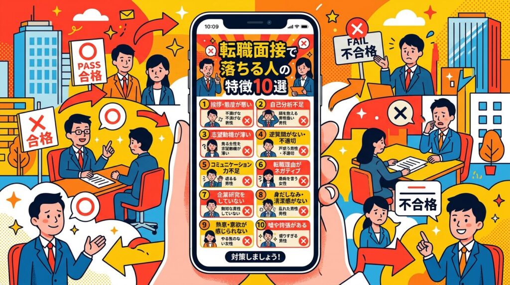 転職面接で不合格になってしまう人の特徴10選を徹底解説。自己PRの弱さ、志望動機の甘さ、NG行動から合格率を上げる具体的な対策法まで完全ガイド。 -