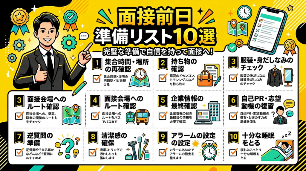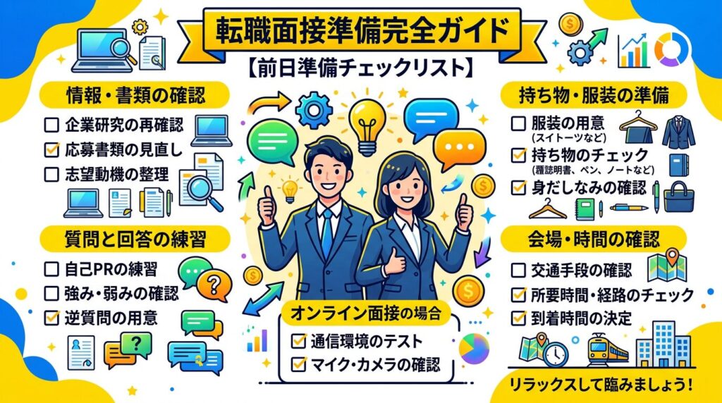 転職面接の前日、何を準備すればいいかわからない方へ。合否を左右する前日準備リスト10項目を完全解説。当日慌てないための完全チェックガイドです。 -