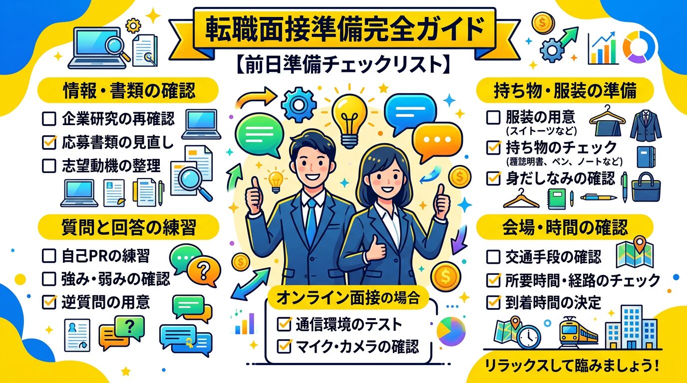 この記事では、転職面接の前日にやるべき10項目のチェックリストを中心に、当日朝の準備・よくある失敗例とその対策・メンタル準備の方法まで、すべてを網羅的に解説します。