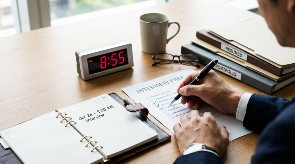 面接前日と当日に必ず確認すべき項目をまとめました。このチェックリストを使えば、当日の不安を大幅に減らせます。